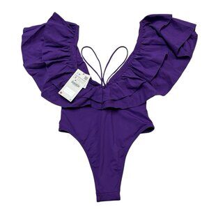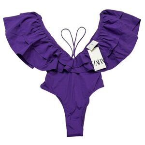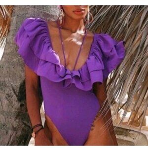 Zara Swimsuit Women S Purple Ruffle Plunging Neckline One Piece Strappy Bodysuit