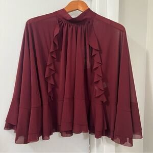 Chic burgundy cape blouse with ruffle details. Perfect for a sophisticated look.