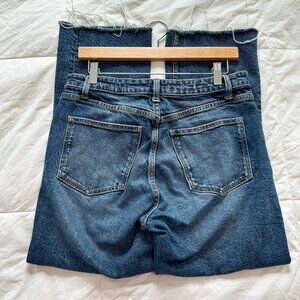 • Details: High-rise fit, subtle flare, cropped ankle length, five-pocket styling, zip fly with button closure, raw-cut hem for a laid-back finish.