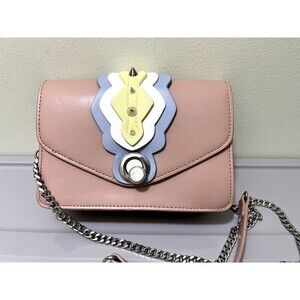 Zara TRF Light Pink Tan Crossbody Handbag Silver Chain Studded. Color sometimes looks light pink, other times tan, depending on the lighting. Long silver chain, can be removed. 8x5x3 big. There is some wear/scratching on the fastening hardware, as seen in photos. Interior lining is in great condition. Fun bag, perfect for spring!
