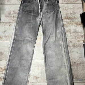 Size 0 (oversized and fits more like a 2 or 4) Mid rise metallic brushed foil denim. Worn once brand new condition but cut the bottoms since they were so long. I'm 5'3" and wore with heels and it they were perfect.