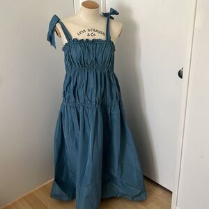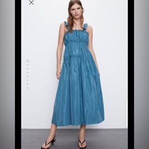 Step out in style with this elegant blue taffeta midi dress. Perfect for any occasion, this dress offers a flattering fit and a vibrant color that stands out. Ties at shoulders. Ruffle details.