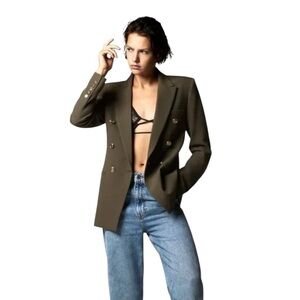 Zara Tailored Green Blazer Double Breasted Embossed Gold Buttons Small