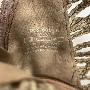 These are so pretty. Tan fabric and faux suede braided bootie. Approx heel height is 4.25 inches. Zip heel and open toe styling. Lovely condition with some darker areas on faux suede heel area.