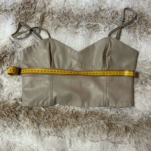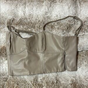 This tan crop top from Zara showcases a bustier style with a fitted design, perfect for a chic and modern look. The thin adjustable straps and bandeau-like neckline add a touch of elegance, while the structured seams enhance its stylish appeal. Ideal for pairing with high-waisted bottoms, this top is a versatile addition to your wardrobe.