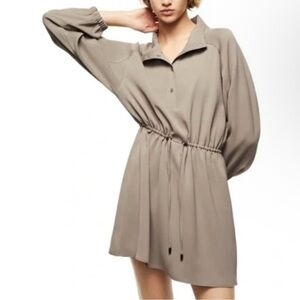 Zara Tan Flowy Mini Dress Button Front Drawstring Waist Tie Taupe Size Medium