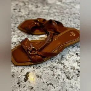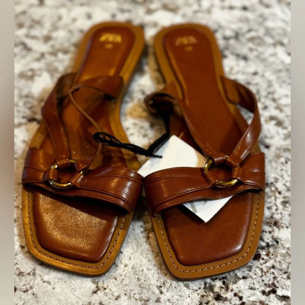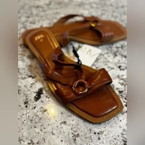 Stylish tan leather sandals featuring a chic ring accent. Ideal for casual outings.