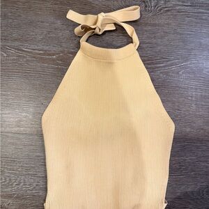 Stylish ribbed tank top. Features a halter neck and tie back. Perfect for casual wear.