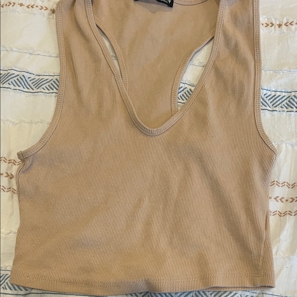 Stylish tan ribbed tank top. Ideal for casual wear. Soft and comfortable fabric.