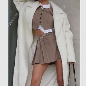 Stylish tan skirt set. Features a pleated skirt and buttoned vest. Perfect for chic outings.