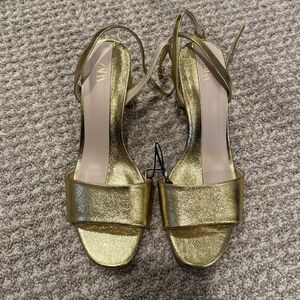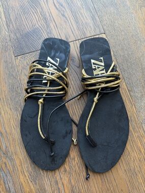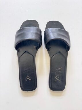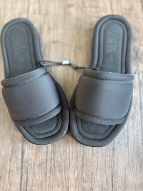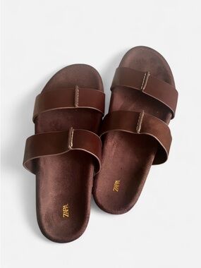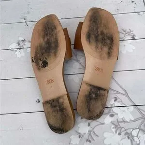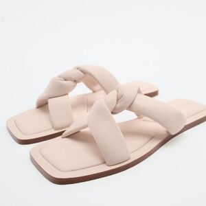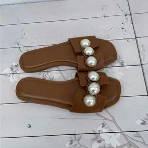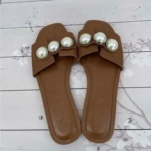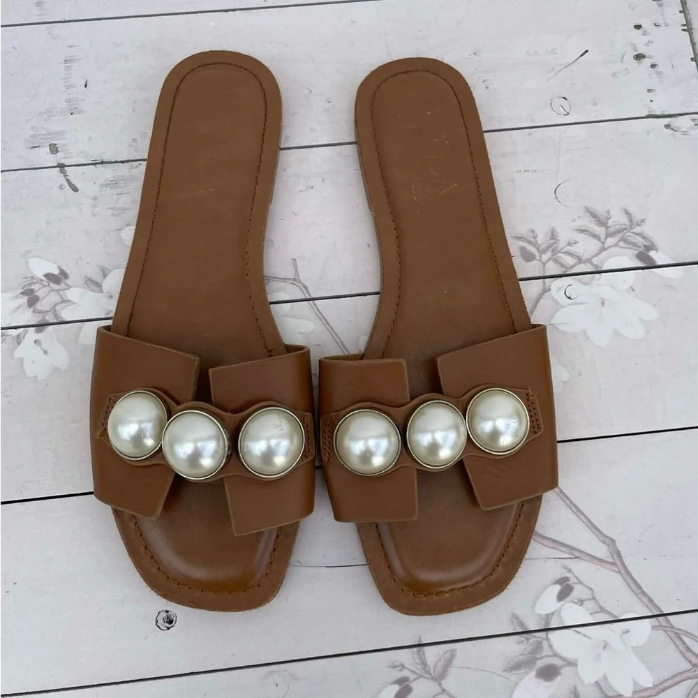 Stylish tan slide sandals from Zara. Decorative pearl clusters on the straps. Smooth upper with a minimalist silhouette. Easy slip-on design for casual wear.