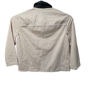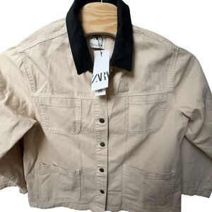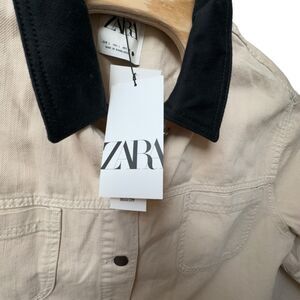 Stylish utility jacket by Zara. Features a tan body with a contrasting black collar. Front button closure and multiple pockets.