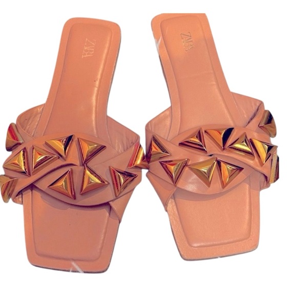 Elevate your style with Zara's tan and gold sandals, featuring a striking geometric pattern on the upper. These slip-on sandals offer a minimalist silhouette with a smooth leather finish, perfect for casual outings. The flat sole ensures comfort while the decorative design adds a touch of elegance.