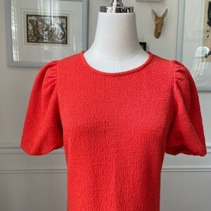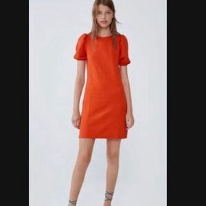 Zara Tangerine Orange Nubby Texture Shift Dress Pouf Short Sleeve M