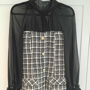 ZARA NEW TEXTURED COMBINATION ORGANZA TWEED SHORT DRESS LONG SLEEVES BLACK WHITE