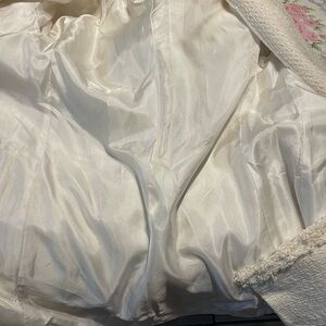 Stylish cream blazer with textured fabric. Features front pockets and elegant design. Ideal for versatile wear.measurements are 17.5pit to pit and 28.5 length