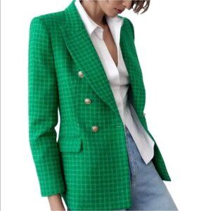 Zara Textured Double Breasted Blazer Coat Jacket Gold Button Green Plaid Large