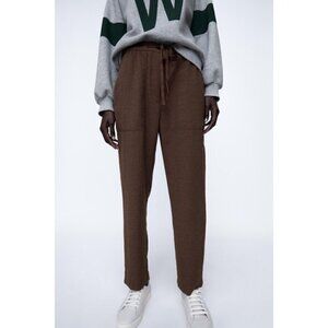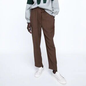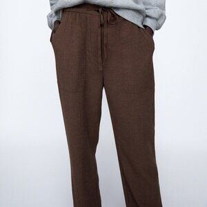Zara Textured High Waisted Drawstring Relaxed Brown Pants Trousers NWT Size XS