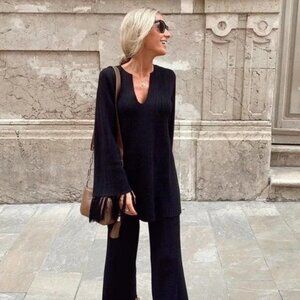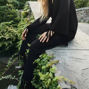 Zara Textured Knit V-neck Tunic with Fringe Long Sleeves S