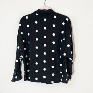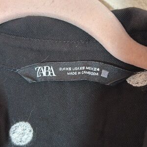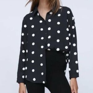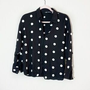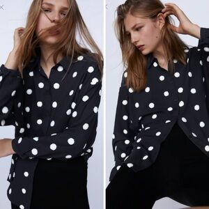 Zara Textured Polka Dot Pom Pom Button Down Shirt Blouse White Black Size XS
