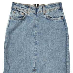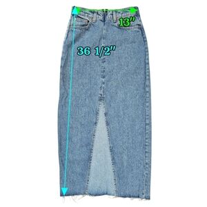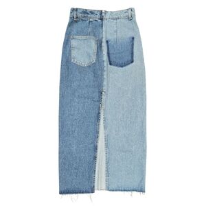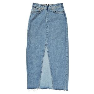 Good used condition, with no tears. A unique rigid denim maxi skirt, with two tone features, a raw hem and a long back slit. Has 4 pockets and a zip closure at the back.