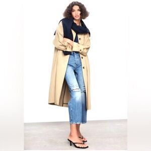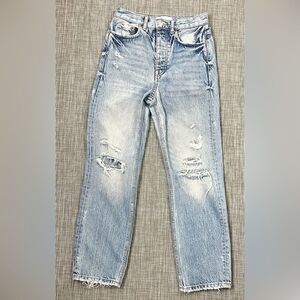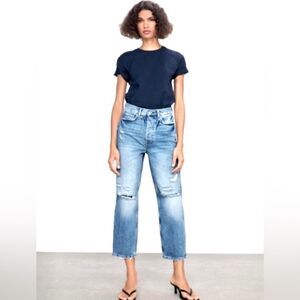 Used in excellent condition Zara The Bliss Straight Leg jeans. High Rise, cropped, button fly, ripped knees and distressed throughout.