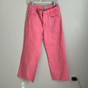 Non stretch , frayed hem, wide leg jeans in pink. High waisted.
