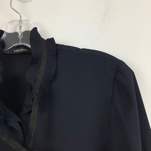 Features: accordion style trim at neck and cuffs, bow tie neck, semi-sheer, 3/4 length sleeves, black ribbon trim, hidden button placket closure, mock neck