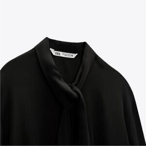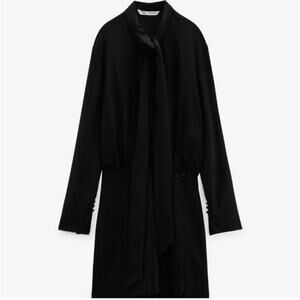 Mini dress made of viscose blend fabric. Adjustable tied round high collar. Long sleeves. Front slit. Hidden in-seam zip closure.