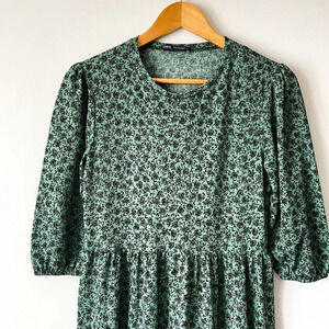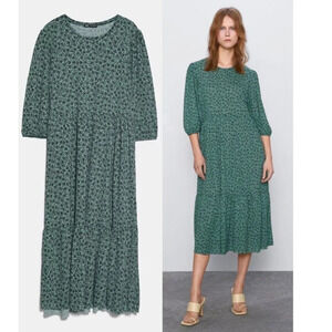 Zara Tiered Floral Midi Dress Green Black Size Small