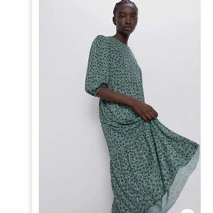 Zara Tiered Floral Midi Dress Green Black Size Small