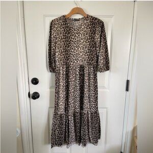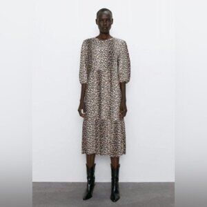Rare Zara Tiered Leopard Print Midi Dress with keyhole closure on back. In excellent preowned condition. Add leopard to your look with this tiered smock dress. Team with white trainers for a casual finish. But we can’t help but worry about bumping into at least five different women who all own the ZARA spotty midi whenever we wear it. A must have addition to your everyday wardrobe! Pullover style with Round neck and 3/4 puffed sleeves. Elastic cuffs with Tiered ruffled A line silhouette and Raw hem. Leopard print. 99% Polyester, 1% Elastane.