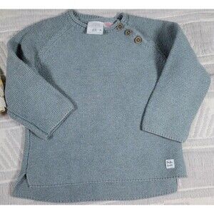 Zara knit sweater (18–24M), 100% cotton in muted blue with button shoulder detail.