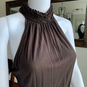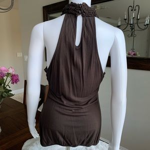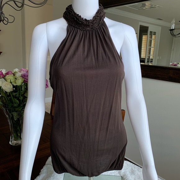 Good used condition. Soft material and fit is very flattering. See in picture 4 the middle button is missing. It is not noticeable or affect the wear of the top.