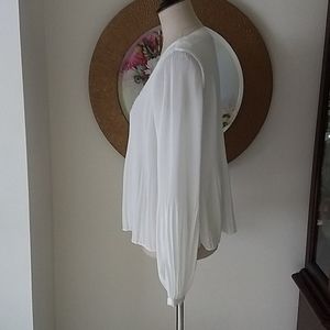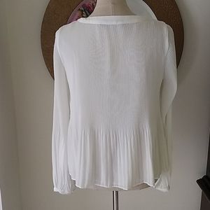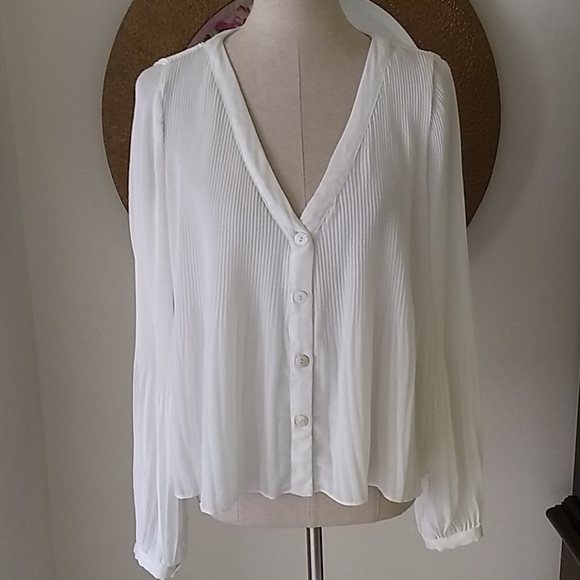 Beautiful blouse by Zara. Has a double pleated pattern. The pleats are thinner on the top and then widen half way down. The sleeves have a similar pattern and the bottom is fuller with cuffs that button. Wear with a great pair of jeans and look great. New without tickets.