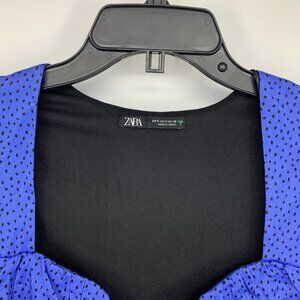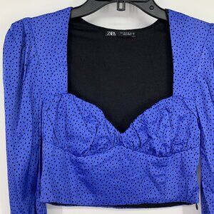 Zara Top Womens Size Small Blue Polka Dot Long Sleeve Cropped Satin Corset. Great pre-owned condition. Side zipper.
