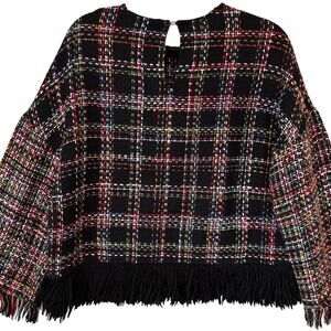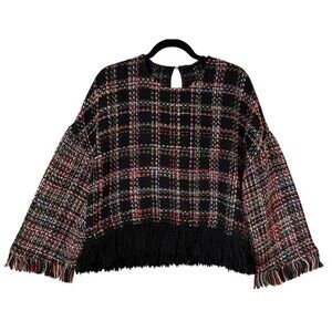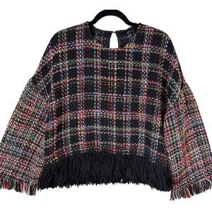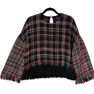 Zara Top Woman's Small Loose Fit Tweed Top Fringe Multi-Color Boho Bell Sleeve
