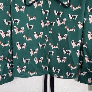 Zara Top Womens XL Dog Print Bow Button Blouse Novelty New Green Blogger Fave