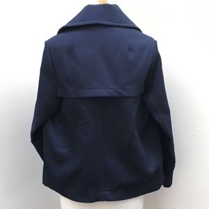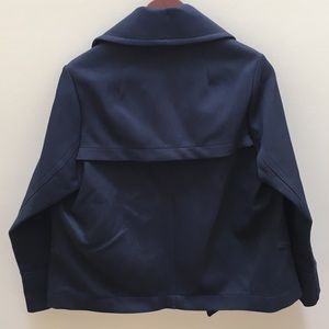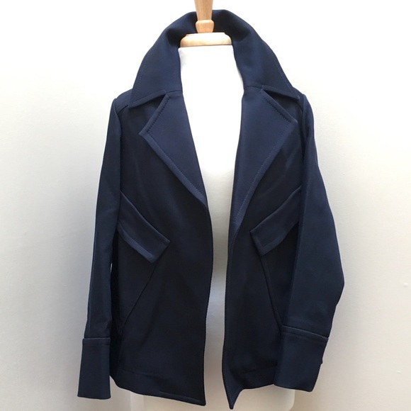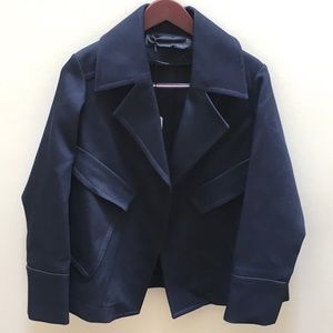 NWT navy blue Zara Topper (no buttons or zipper) jacket, with two large hip pockets, women’s size Medium. The material is: 44% cotton, 32% wool & 24% Poliammide. Retail price 139 Euro is equal to $165 USD. Perfect Fall & Winter jacket in classic navy blue color that goes with everything!