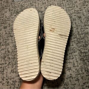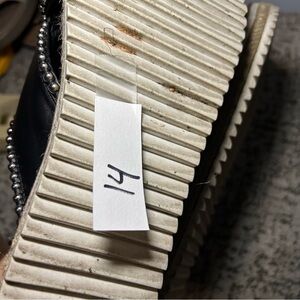 Zara Trafaluc Black & Silver Beaded Criss-Cross Chunky Platform Sandals. Please note that a Zara size 40 translates to a US size 9. Has some wear in the inside near the toes. As shown in photos above. Has a small stain on the strap. Also shown in photos above. Minimal signs of wear on the bottoms. Feel free to make a reasonable offer through the offer button!