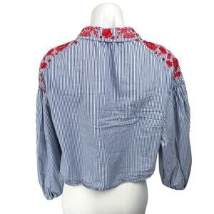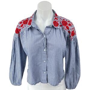 Zara Trafaluc Blue Red Floral Embroidered Striped Button Down Shirt Top Size L