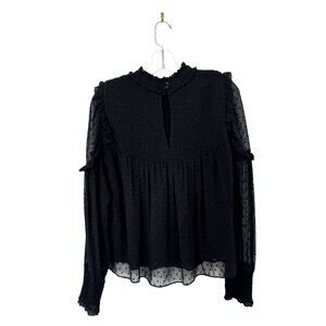 Zara Black Blouse. Features ruffled neck, smocked chest and wrist areas, lined bodice, sheer polka dot pattern, key hole back.