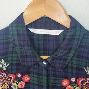 Blue, black, and green plaid button up shirt made by Zara Trafaluc in size Small. Colorful floral embroidery with beaded accents in pinks, purples, greens, and white. Casual button-down style has a relaxed and slightly longer fit. 100% Viscose feels soft and comfortable almost like flannel. The embroidery is 100% Polyester. There is fuzziness throughout from normal wash and wear (picture 9, top left corner for example). Otherwise, in EUC with no holes, snags, or stains. Bundle with other items for the best deal!