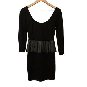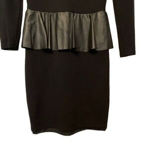 Feminine and chic black bodycon dress with faux leather peplum detail for added style! Stretchy to fit to you, zips in the back.