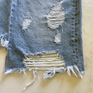 Distressed denim fringe is part of the style and not damaged.