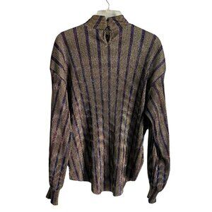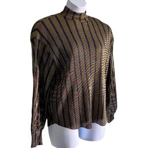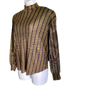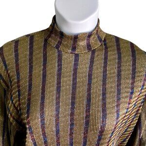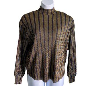Zara Trafaluc Long Sleeve Top with shiny shimmer. Sparkles 81% Polyester 19" metallicized fiber. Gold with blue/red stripes. 2 buttons on back of neck.