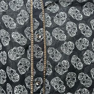 Zara Trafaluc MMXII Collection Long Sleeve Sheer, Black Button Up Shirt, Ivory Colored Skulls, Button Wrist, Gold Colored Chain Accent on the Front, Women's Medium