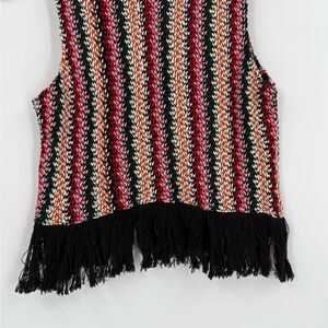 Trendy and retro-inspired Zara striped knit tank top. Features a sleeveless cut, multicolor vertical stripe knit pattern in black, pink, orange, and cream, and a fringe hemline for a boho-chic finish. A perfect festival, vacation, or night-out piece that pairs effortlessly with denim, skirts, or layered under a jacket. Eye-catching striped knit top with fringe detail — adds instant boho flair to any outfit! Great pre-owned condition.