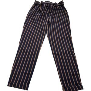 Zara Trafaluc Pants Womens Small Navy Blue Striped Paperbag Waist Tie Belt Casual