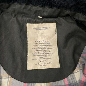 This oversized Zara Trafaluc coat combines functionality with style, featuring a durable olive green fabric, black corduroy collar, and practical multiple pockets.